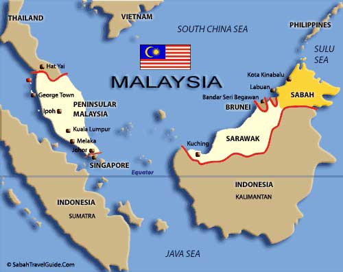 馬來西亞位于東南亞,北緯1—7度;東經110—119度,國土被南中國海分隔成東、西兩部分。西馬位于馬來半島南部,北與泰國接壤,南與新加坡隔柔佛海峽相望,東臨南中國海,西瀕馬六甲海峽。東馬位于加裏曼丹島北部,與印尼、菲律賓、文萊相鄰。