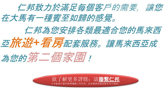 仁邦集團利用自身優勢以及本地各類合作夥伴,為你在馬的投資和生活進行全方位顧問。如有任何需要請